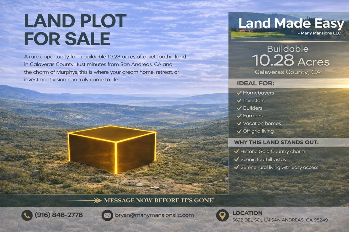 A rare opportunity to own 10.28 acres of private, buildable land in the foothills of Calaveras County just minutes from San Andreas and the charm of Murphys.