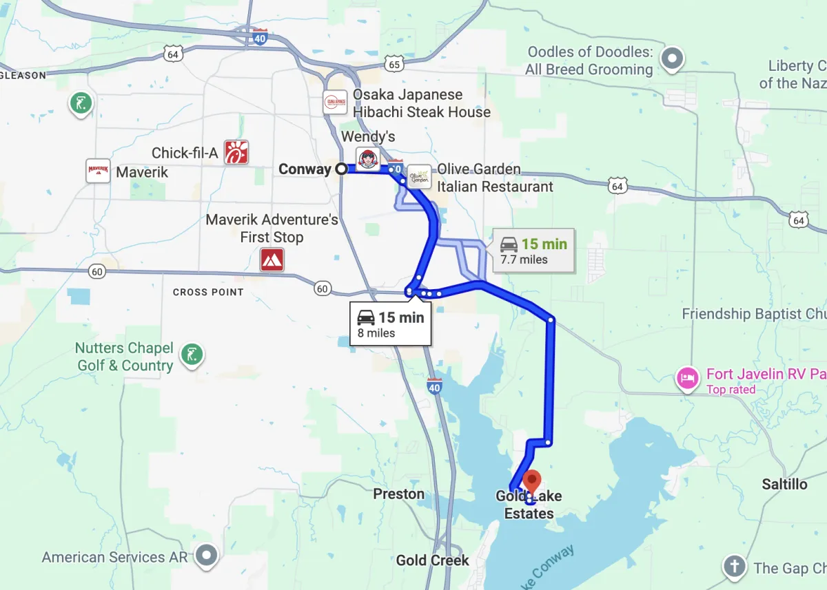 Gold Lake Estates is a recorded subdivision in Faulkner County, near Conway. Its listings and maps show a mix of residential homes and vacant lots.